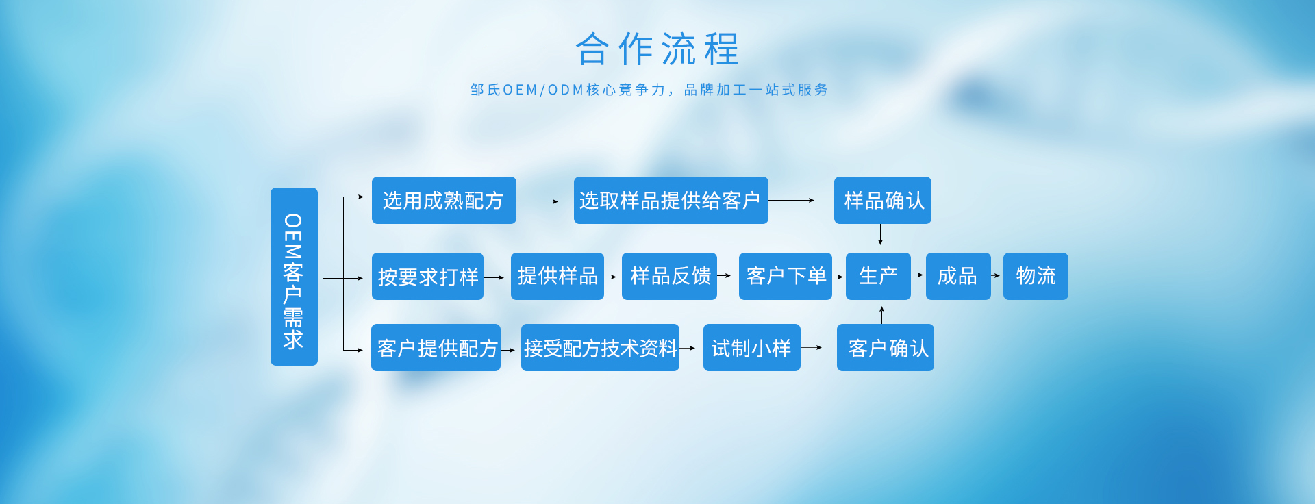在延續高質量產品和服務的同時,鄒氏生物始終秉承著純粹的生產理念,在研發、生產、品控、營銷等多方面升級,配備雄厚的科研力量,引進先進生產設備,遵循嚴苛的品質管理標準,提供專業的全方位營銷服務,最大程度地實現資源整合,致力于成為世界優秀化妝品工廠。為廣大品牌商以及消費市場輸送品質優越、高效安全的日用化工、美容美妝、肌膚護理產品。